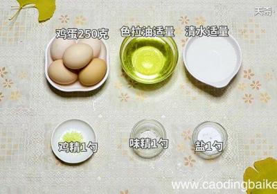 步骤1准备食材:鸡蛋250克、盐1勺、味精1勺、鸡精1勺、清水适量、色拉油适量 。步骤2将鸡蛋打入碗中,加盐、味精、鸡精、清水,搅拌至调料完全融化 。步骤3锅中倒入少许油,油温烧至8成热后,倒入鸡蛋液 。步骤4加盖用小火焖10分钟 。步骤5...