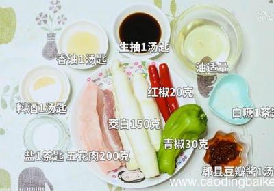 步骤1准备食材:茭白150克、红椒20克、青椒30克、盐1茶匙、料酒1汤匙、香油1汤匙、生抽1汤匙、白糖1茶匙、油适量、郫县豆瓣酱1汤匙 。步骤2青椒切块 。步骤3红椒切块 。【茭白回锅肉的做法 如何做茭白回锅肉】步骤4茭白切菱形块 。步骤...