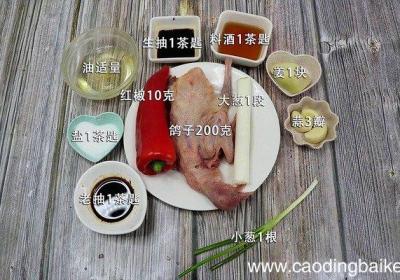 步骤1准备食材:鸽子200克、大葱1段、小葱1根、红椒10克、姜1块、蒜3瓣、油适量、盐1茶匙、生抽1茶匙、老抽1茶匙、料酒1茶匙 。步骤2鸽子洗净剁块 。步骤3大葱切片 。步骤4小葱切葱花 。步骤5红椒洗净切小块 。【红烧鸽子的做法 红烧...