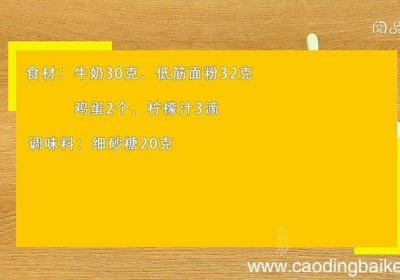 步骤1食材:牛奶30克、低筋面粉32克、鸡蛋2个、柠檬汁3滴 。调味料:细砂糖20克 。步骤2鸡蛋蛋白蛋黄分离 。步骤3蛋黄中加入牛奶拌匀,筛入面粉,搅拌至无颗粒状 。步骤4蛋清中滴入柠檬汁,分3次加入细砂糖,打发 。步骤5将蛋白倒入蛋黄糊...