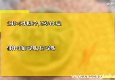 步骤1所需食材:小米椒2个,冰草400克 。所需调料:生抽1茶匙,盐1茶匙 。步骤2冰草洗净 。【凉拌冰草怎么做 凉拌冰草的做法】步骤3小米辣切圈 。步骤4冰草在沙拉盆中调入盐、生抽、小米辣,拌匀即可装盘 。...
