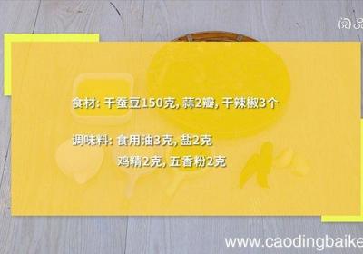 步骤1食材:干蚕豆150克,蒜2瓣,干辣椒3个 。调味料:食用油3克,盐2克,鸡精2克,五香粉2克 。步骤2干蚕豆用温水浸泡30分钟,捞出沥干 。步骤3蒜切末步骤4干辣椒切段 。步骤5热锅倒油,油温5成热时,下蚕豆,炒2分钟,放蒜、干辣椒,...
