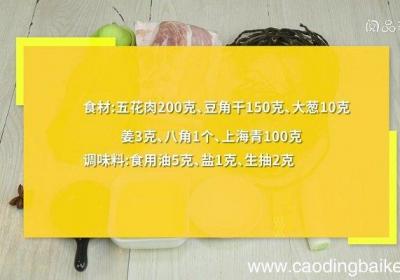 步骤1食材:五花肉200克、豆角干150克、大葱10克、姜3克、八角1个、上海青100克 。调味料:食用油5克、盐1克、生抽2克 。步骤2上海青对半切开,放入沸水锅中焯烫30秒,捞出备用 。步骤3五花肉切薄片 。步骤4豆角干用温水泡软 。步...