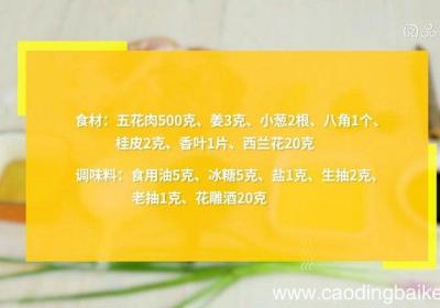 步骤1食材:五花肉500克、姜3克、小葱2根、八角1个、桂皮2克、香叶1片、西兰花20克、食用油5克、冰糖5克、盐1克、生抽2克、老抽1克、花雕酒20克 。步骤2五花肉洗净,切块,冷水入锅,水开后煮2分钟捞出,洗净浮末,沥干水分备用 。步骤...