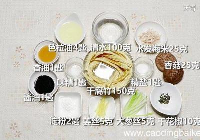 步骤1准备食材:干腐竹150克、水发海米25克、香菇25克、大葱丝5克、姜丝5克、淀粉2匙、干花椒10克、清水100克、精盐1勺、味精1匙、香油1匙、酱油1匙、色拉油4匙 。步骤2将泡发的腐竹切成3厘米左右的长条,装入碗中 。【椒油腐竹的做...