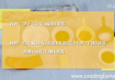 步骤1准备食材:笋干150克、麻油1茶匙、红尖椒40克、食盐1茶匙、姜1小块、生抽1汤匙、香醋1汤匙、白糖1茶匙 。步骤2先将笋干提前浸泡,然后捞出沥干水分 。步骤3锅中烧水,将笋干放入锅中,煮30分钟,断生后捞出 。步骤4姜切丝 。步骤5...