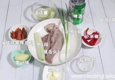 步骤1准备食材:猪舌头200克,姜1块、蒜3瓣、大葱1根、盐1茶匙、小米椒5克、白酒1茶匙、海底捞麻辣底料、啤酒少许、油适量、小葱1根 。步骤2猪舌头洗净切片备用 。步骤3姜切片 。步骤4大葱切片 。步骤5蒜切片 。步骤6小米椒切圈备用 。...