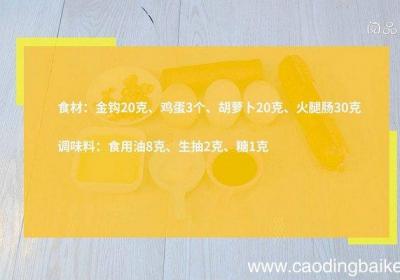 步骤1食材:金钩20克、鸡蛋3个、胡萝卜20克、火腿肠30克、食用油8克、生抽2克、糖1克 。步骤2金钩用清水浸泡10分钟 。【金钩烘蛋的做法 金钩烘蛋怎么做】步骤3切碎 。步骤4胡萝卜切末 。步骤5火腿肠切末 。步骤6鸡蛋打散、加入金钩、...