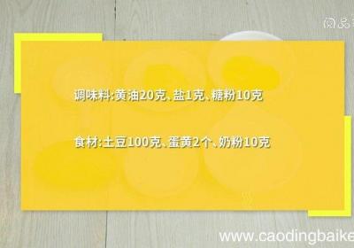 步骤1食材:土豆100克、蛋黄2个、奶粉10克 。调味料:黄油20克、盐1克、糖粉10克 。步骤2土豆去皮,切块,放入蒸锅中蒸15分钟,取出,压成泥 。步骤3土豆泥中加入黄油软化,拌匀,加入蛋黄、奶粉、盐、糖粉,拌匀,装入裱花袋中 。步骤4...