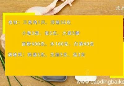 步骤1食材:三黄鸡1只、洋葱50克、小葱3根、姜5克、大蒜5瓣、面粉400克、水160克、白酒40克调味料:料酒5克、生抽5克、盐3克步骤2洋葱切丝 。【叫花鸡的做法 叫花鸡怎么做】 步骤3小葱打葱结 。步骤4姜切片 。步骤5大蒜切粒 。步...