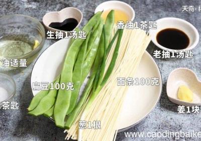 步骤1准备食材:扁豆100克、面条100克、葱1根、香油1茶匙、生抽1汤匙、盐1茶匙、老抽1汤匙、姜1块、油适量 。步骤2姜切丝,葱切葱花,扁豆用手掰断 。步骤3面抖散放入锅中,大火烧开捞出备用 。步骤4起锅倒油,油热放入葱、姜爆香,再放入...
