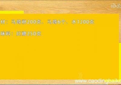 步骤1食材:马蹄粉200克、马蹄6个、水1200克 。调味料:红糖250克 。步骤2马蹄去皮,切小丁 。步骤3锅中倒入600克水 。步骤4加入马蹄丁、红糖,熬煮至红糖融化 。【马蹄糕的做法 马蹄糕怎么做】步骤5马蹄粉中加入600克水拌匀 。...