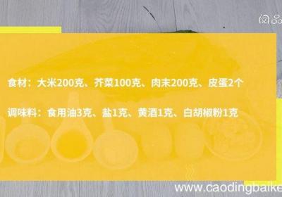 步骤1食材:大米200克、芥菜100克、肉末200克、皮蛋2个 。调味料:食用油3克、盐1克、黄酒1克、白胡椒粉1克 。步骤2大米洗净,放锅里大火煮开后小火慢煮15分钟,煮后关火焖15分钟 。步骤3芥菜洗净,水沸后焯水30秒后,捞出过凉水,...