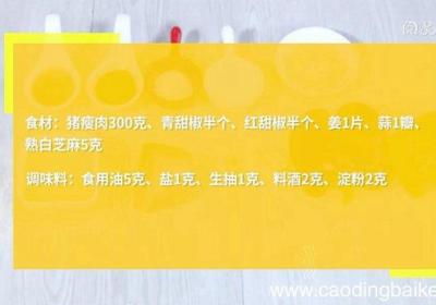 步骤1食材:猪瘦肉300克、青甜椒半个、红甜椒半个、姜1片、蒜1瓣、熟白芝麻5克调味料:食用油5克、盐1克、生抽1克、料酒2克、淀粉2克步骤2青甜椒洗净、切丝步骤3红甜椒洗净、切丝步骤4姜切末步骤5大蒜切末步骤6瘦肉洗净、切条、装入碗中、加...