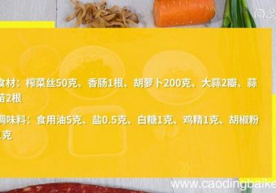 发布时间: 7小时前步骤1食材:榨菜丝50克、香肠1根、胡萝卜200克、大蒜2瓣、蒜苗2根 。调味料:食用油5克、盐0.5克、白糖1克、鸡精1克、胡椒粉1克 。步骤2胡萝卜洗净、切片 。步骤3香肠切片 。步骤4大蒜切末 。步骤5蒜苗切段 。步骤6热锅倒油,油温...
