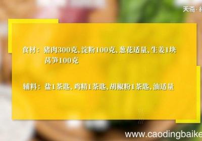 步骤1猪肉300克,红薯粉150克,葱花适量,莴笋100克,生姜1块、盐1茶匙,鸡精1茶匙,胡椒粉1茶匙步骤2猪肉切条 。步骤3姜切末 。步骤4加入1茶匙盐,加入胡椒粉、红薯粉、清水搅拌均匀 。步骤5热锅下油,放入猪肉,炸至表面金黄酥脆,捞...
