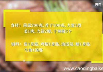 步骤1食材:茼蒿200克、香干100克、大葱1段、姜黄1块、大蒜2瓣 。辅料:盐1茶匙、鸡精1茶匙、干辣椒3个、油适量。步骤2豆干洗净切成条 。步骤3茼蒿杆切成段,放入清水中清洗 。步骤4姜切末 。步骤5蒜切片 。步骤6干辣椒切碎 。步骤7...