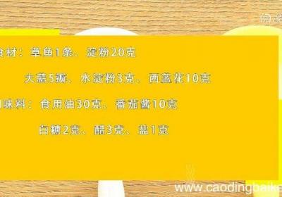 步骤1食材:草鱼1条、淀粉20克、大蒜5瓣、水淀粉3克、西蓝花10克 。调味料:食用油30克、番茄酱10克、白糖2克、醋3克、盐1克 。步骤2西蓝花放入沸水锅中,焯烫30秒,捞出备用 。步骤3草鱼从脊骨处片开,鱼肉片平均分开到鱼尾,保留鱼尾...