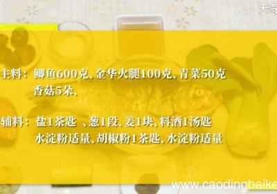 步骤1准备食材:鲫鱼600克,金华火腿100克,青菜50克,香菇5朵,食盐1茶匙,葱1段,姜1块,料酒1汤匙,水淀粉2汤匙,胡椒粉1茶匙步骤2姜切片 。步骤3大葱切段 。步骤4火腿切片 。步骤5青菜切成四瓣 。【金腿鲫鱼怎么做 金腿鲫鱼的做...