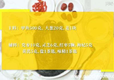 步骤1准备食材:甲鱼500克、党参10克、灵芝6克、红枣5颗、枸杞5克、黄芪5克、大葱20克、姜1块、盐1茶匙、味精1茶匙 。步骤2姜切片 。步骤3大葱切段 。步骤4甲鱼剁去头,用热水烫刮去边和脚的黑皮,揭去盖 。步骤5以冷水冲干净,再切块...