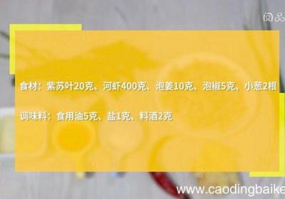 步骤1食材:紫苏叶20克、河虾400克、泡姜10克、泡椒5克、小葱2根 。调味料:食用油5克、盐1克、料酒2克 。步骤2河虾洗净 。步骤3【紫苏炒虾的做法 紫苏炒虾怎么做】紫苏叶切碎 。步骤4泡姜切碎 。步骤5泡椒切碎 。步骤6小葱切葱花...
