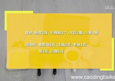 发布时间: 12小时前步骤1【醋焖粉皮的做法,醋焖粉皮怎么做】食材:粉皮2张、干辣椒3个、大蒜2瓣、小葱1根 。调味料:食用油5克、生抽2克、老抽1克、醋3克、白糖1克 。步骤2粉皮用温水洗净,切长条 。步骤3干辣椒切段 。步骤4大蒜切末 。步骤5小葱切葱花 。...