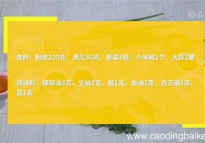 步骤1食材:粉皮200克、黄瓜30克、香菜1根、小米椒2个、大蒜2瓣调味料:辣椒油3克、生抽2克、醋1克、香油2克、白芝麻1克、盐1克步骤2粉皮切条 。步骤3黄瓜切丝 。步骤4香菜切段 。步骤5小米椒切圈 。步骤6大蒜切末 。步骤7粉皮、黄...
