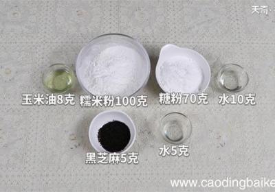 步骤1准备食材:糯米粉100克、糖粉70克、玉米油8克、水10克、黑芝麻5克、水5克 。步骤2碗中倒入糖粉 。步骤3糖粉中加入玉米油 。步骤4糖粉加入水 。步骤5混合后拌匀 。步骤6然后装入锡纸盒中 。步骤7放入烤箱烤一分钟 。步骤8将烤好...