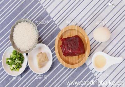 食材:大米80克、牛肉80克、鸡蛋1个、姜1块、蒜1瓣、葱1根步骤:1.大米洗净,在清水中浸泡30分钟,鸡蛋1个磕入碗中打散;2.姜1块切丝、葱1根切葱花,牛肉切小?。?放入料酒1勺、姜丝拌匀腌制5分钟,腌好的牛肉中倒入适量开水,汆烫好后捞...