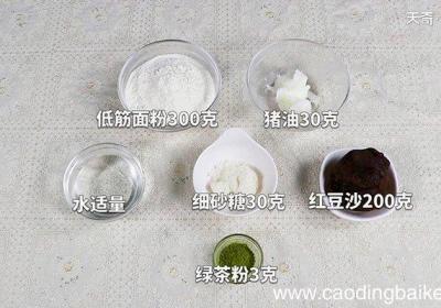 步骤1准备食材:低筋面粉300克、绿茶粉3克、红豆沙200克、细砂糖30克、猪油30克、水适量 。步骤2将面粉倒入碗中,加入细砂糖、清水,倒入提前融化好的猪油,搅拌均匀,制成面团 。步骤3将揉好的面团分成两份,一份放在一旁松弛30分钟 。步...