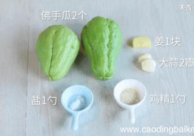 步骤1准备食材:佛手瓜2个、姜1块、大蒜2瓣、盐1勺、鸡精1勺 。步骤2佛手瓜洗净对半切开,去核,切片 。步骤3姜切末 。步骤4蒜切末 。步骤5锅中倒适量油,油温烧至7成热,放入蒜末炒香,放入佛手瓜炒至断生 。步骤6调入盐1勺、鸡精1勺炒匀...