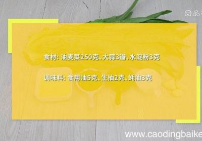 步骤1食材:油麦菜250克、大蒜3瓣、水淀粉3克 。调味料:食用油5克、生抽2克、蚝油3克 。步骤2油麦菜切段 。步骤3锅中加水煮沸,放入油麦菜焯烫30秒,捞出装盘 。步骤4大蒜切末 。步骤5炒锅中油温5成热时,下入蒜末爆香,放入生抽、蚝油...