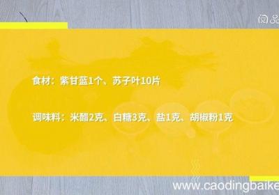 步骤1食材:紫甘蓝1个、苏子叶10片 。调味料:米醋2克、白糖3克、盐1克、胡椒粉1克 。步骤2紫甘蓝掰成片 。步骤3苏子叶洗净 。步骤4将紫甘蓝、苏子叶交替叠放入容器中 。步骤5锅中放入容器一半容量清水,加入米醋、白糖、盐、胡椒粉,煮至白...
