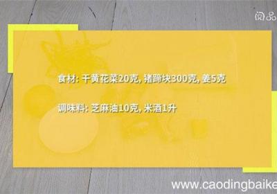 步骤1食材:干黄花菜20克,猪蹄块300克,姜5克 。调味料:芝麻油10克,米酒1升 。步骤2猪蹄块用清水浸泡30分钟,捞出 。步骤3干黄花菜用清水浸泡20分钟,捞出 。步骤4姜切片 。步骤5炒锅中倒入芝麻油,加热后,放入姜片,炒香,倒入猪...