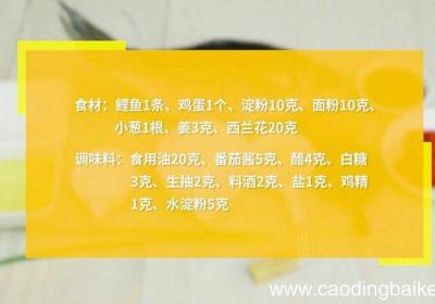 发布时间: 12小时前步骤1食材:鲤鱼1条、鸡蛋1个、淀粉10克、面粉10克、小葱1根、姜3克、西兰花20克、食用油20克、番茄酱5克、醋4克、白糖3克、生抽2克、料酒2克、盐1克、鸡精1克、水淀粉5克 。步骤2鸡蛋打散 。步骤3加入淀粉、面粉、少许清水拌匀成糊...