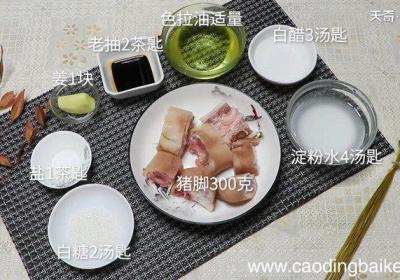 发布时间: 11小时前步骤1准备食材:猪脚300克、姜1块、色拉油适量、糖2汤匙、白醋3汤匙、老抽2茶匙、盐1茶匙、淀粉水4汤匙 。步骤2姜切片备用 。步骤3再将猪脚洗净后放入高压锅内,加入姜片,加入水盖过表面,上汽后算起,煮八分钟 。步骤4上汽后算起,煮八分钟...
