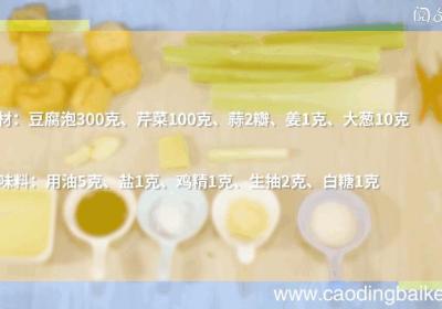 步骤1准备食材:豆腐泡300克、芹菜100克、蒜2瓣、姜1克、大葱10克、食用油5克、盐1克、鸡精1克、生抽2克、白糖1克 。步骤2豆腐泡对半切开 。步骤3蒜切末 。步骤4姜切末 。步骤5大葱切片 。步骤6芹菜洗净、去筋、切片 。步骤7热锅...