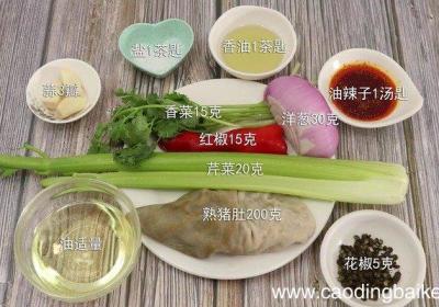 步骤1主要材料:熟猪肚200克、洋葱30克、芹菜20克、香菜15克、蒜3瓣、盐1茶匙、香油1茶匙、油辣子1汤匙、花椒5克、油适量、红椒15克 。步骤2猪肚切条 。步骤3洋葱切丝 。步骤4芹菜切段 。步骤5香菜切段 。步骤6蒜切末 。步骤7红...