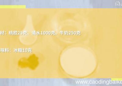 步骤1准备食材:桃胶25克、清水1000克、牛奶250克、冰糖10克 。步骤2桃胶用清水提前浸泡12小时 。步骤3锅中加入清水、放入桃胶、煮沸后转小火炖40分钟 。步骤4倒入牛奶、继续小火炖30分钟 。步骤5接着加冰糖、再炖15分钟即可 。...