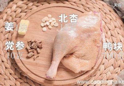 步骤1准备食材:鸭块700克、北杏15克、党参10克、姜1块 。步骤2肉剁成小块 。步骤3姜切片 。步骤4锅中烧水加入肉,倒1勺料酒焯水,大火煮半分钟 。步骤5砂锅中加入鸭肉块、党参、北杏仁、料酒,加盖煮60分钟 。步骤6最后调入1勺盐,加...