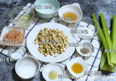 步骤1准备食材:虾仁100克、腰果100克、西芹200克、料酒1汤匙、胡椒粉1茶匙、盐1茶匙、生粉1汤匙、姜1块、水淀粉1汤匙、麻油1茶匙、鸡蛋液半个 。步骤2姜切末 。步骤3西芹改刀切成小段 。步骤4虾仁放入碗中加入盐、生粉和半个鸡蛋的蛋...