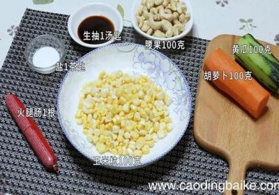 步骤1准备食材:腰果100克、玉米粒100克、火腿肠1根、胡萝卜100克、黄瓜100克、盐1茶匙、生抽1汤匙 。步骤2火腿肠、胡萝卜、黄瓜切丁 。【腰果玉米的做法 腰果玉米怎么做】步骤3油温50度放入腰果,小火炸变色后捞出备用 。步骤4起锅...