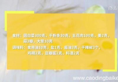 步骤1食材:圆白菜300克,干粉条30克,五花肉100克,姜2克,蒜3瓣,大葱10克调味料:食用油10克,盐1克,酱油3克,干辣椒3个,鸡精2克,豆瓣酱2克,料酒2克步骤2圆白菜撕小块 。步骤3五花肉切片 。步骤4干粉条用温水泡发10分钟...
