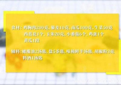 步骤1所需食材:鸡胸肉200克藜麦10克、南瓜100克、生菜50克、西兰花1个、玉米20克、小番茄6个、鸡蛋1个、黄瓜1段 。所需调料:橄榄油2汤匙、盐5茶匙、味极鲜半汤匙、胡椒粉3克、料酒1汤匙 。步骤2小碗中加入橄榄油1勺、味极鲜半勺、...