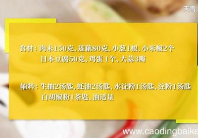 【日本豆腐蒸藕圆怎么做 日本豆腐蒸藕圆的做法】步骤1食材:肉末150克、莲藕50克、小葱1根、小米椒2个、日本豆腐1根、鸡蛋1个、大蒜10克 。辅料:生抽1汤匙、蚝油2汤匙、水淀粉1汤匙、淀粉1汤匙、白胡椒粉1茶匙、油适量 。步骤2小葱切成...