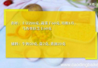 步骤1食材: 土豆200克、蔬菜丁60克、培根1片、马苏里拉芝士60克、牛奶50克、盐2克、黄油20克 。步骤2培根切成小丁 。【芝士焗土豆泥的做法 芝士焗土豆泥怎么做】步骤3土豆去皮切片 。步骤4放入蒸锅蒸熟 。步骤5用勺子压成泥 。步骤...