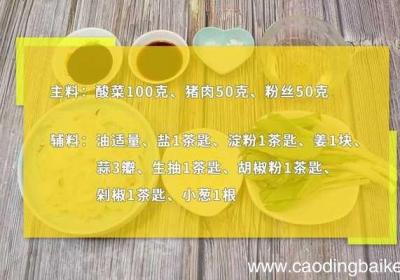步骤1准备食材:酸菜100克、猪肉50克、粉丝50克、姜1块、蒜3瓣、小葱1根 。步骤2酸菜洗净切碎 。步骤3猪肉洗净切丝 。步骤4粉丝用温水泡软 。步骤5蒜切末 。步骤6姜切末 。步骤7小葱切葱花 。步骤8首先碗中倒入猪肉,加入盐、淀粉、...