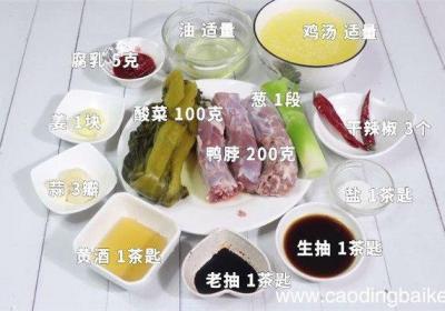 步骤1主料:鸭脖200克、酸菜100克 。辅料:姜1块、蒜3瓣、葱1段、干辣椒3个、老抽1茶匙、生抽1茶匙、黄酒1茶匙、盐1茶匙、腐乳5克、鸡汤适量、油适量 。步骤2鸭脖洗净剁小块 。步骤3姜切片 。步骤4蒜切片 。步骤5葱切片 。步骤6干...