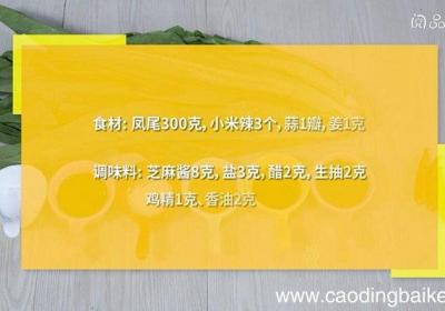 步骤1食材:凤尾300克,小米辣3个,蒜1瓣,姜1克 。调味料:芝麻酱8克,盐3克,醋2克,生抽2克,鸡精1克、香油2克 。步骤2凤尾对半切开,再拦腰切断,放入清水中,加2克盐,浸泡20分钟,取出沥干,装盘 。步骤3蒜切末 。步骤4姜切末...