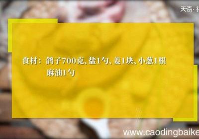 步骤1食材: 鸽子700克、盐1勺、姜1块、小葱1根、麻油1勺 。步骤2鸽子洗净剁成块 。步骤3姜切丝 。步骤4小葱切花 。【清蒸鸽子的做法 清蒸鸽子怎么做】步骤5鸽子肉加入盐1勺、姜丝、麻油1勺拌匀,放入盘中 。步骤6蒸锅水沸后,放入蒸锅...